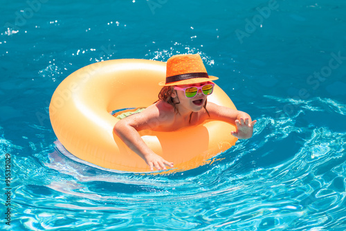 Child boy in swimming pool with inflatable ring. Kids swim in water pool on summer day. Swim for child on float. Funny kids summer face.