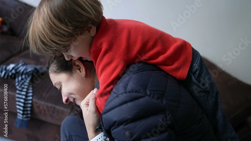 Child embracing mother back. Little boy jumping on parent surprise. Authentic real life love relationship