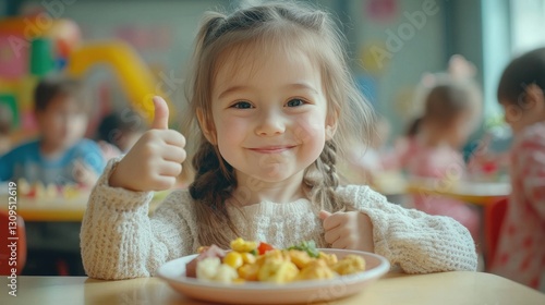 Child giving a thumbs up with a healthy meal, promoting good nutrition.