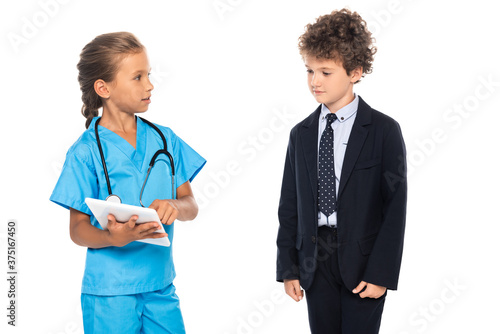 child in costume of doctor using digital tablet near curly boy in formal wear isolated on white