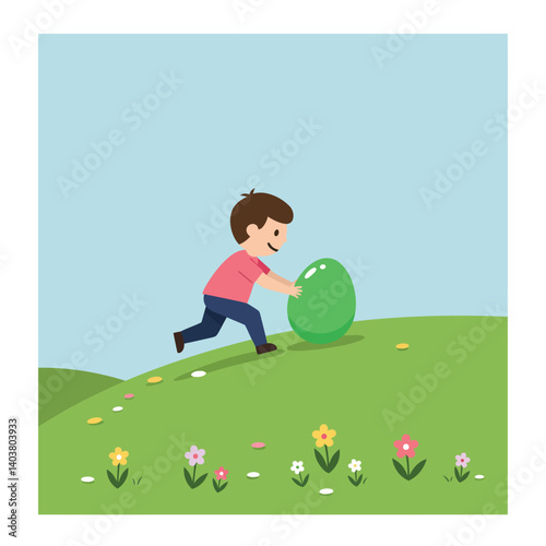 children, egg, green, hill, flower, grass, smile, play, nature, cute, vibrant, simple, fun, vector, digital, art, design, illustration, character, landscape, activity, spring, seasonal, joyful, youth, cartoon, movement, rolling, colourful, scene, happy, adventure, childhood, playful, animation, graphic, flat, minimal, creative, engaging, cheerful