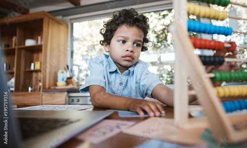 Child, kindergarten and home learning with abacus, toys or numbers education for thinking, development and growth. Boy student, homework and elearning math game for young nursery homeschool kid
