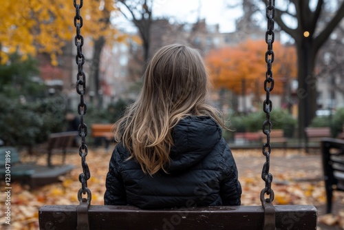 swing, children, park, autumn, leaf, tree, serenity, playground, outdoors, city, backview, nature, solitude, foliage, bench, girl, fun, leisure, season, playground equipment, autumn color, peaceful, recreational, swinging, lifestyle, quiet, childhood, scenery, enjoyment, youth, beauty, calmness, landscape, environment, warm tones, casual clothes, motion