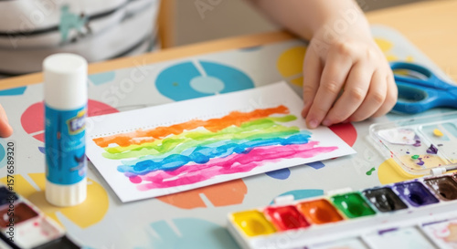 children, painting, rainbow, watercolor, paper, art, supply, table, scissors, colours, creative, activity, education, learning, craft, artwork, palette, hand, brush