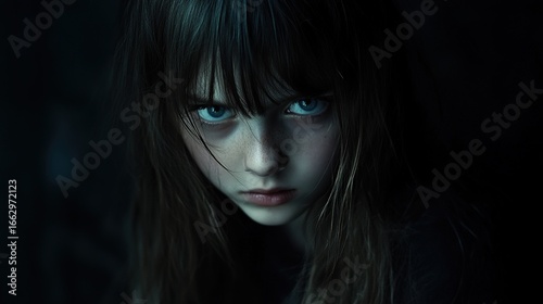 children, portrait, dark background, innocent, childhood, photo, emotion, expression, long hair, eye, texture, quiet, mystery