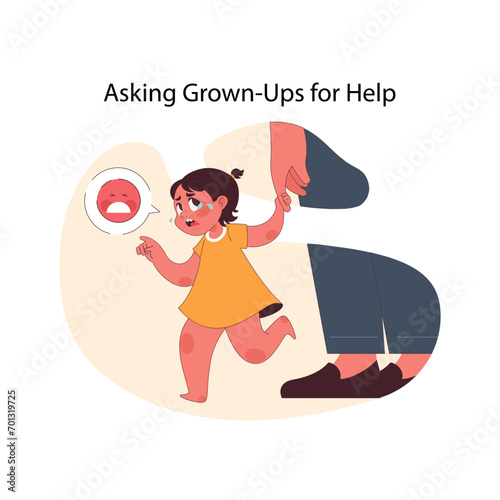 Child seeking assistance concept. A small girl reaches out to an adult for help, expressing her distress with a sad facial icon, highlighting the importance of adult guidance. Flat vector illustration