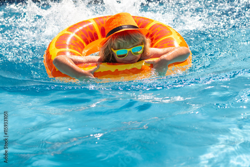 Child splashing in swimming pool. Swim water sport activity on summer vacation with child. Kids water toys.