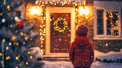 Child standing in the snow gazing at a house decorated with christmas lights during a snowy evening