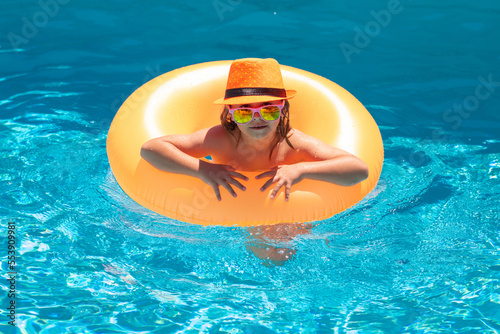 Child swim with float ring on summer vacation holidays. Kid relax on the beach or pool.