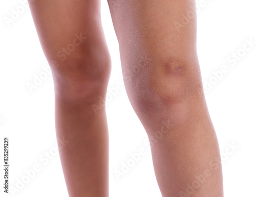 Child with bruise on leg against white background, closeup