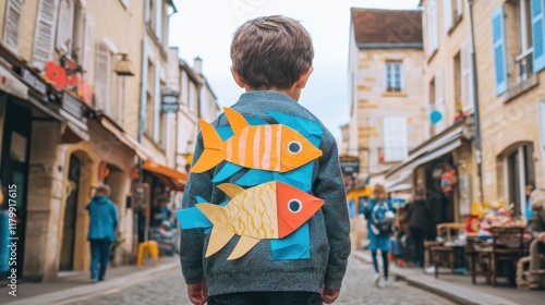 Child with colorful fish cutouts on jacket walking through a charming street festival. April fools day concept