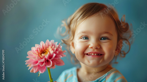 Child with Curly Hair Smiling while Holding a Pink Flower in a Playful Setting