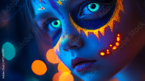 face, paint, glow, children, girl, eye, light, skittish, halloween, blue, orange, yellow, skin, make-up, dark, bright, fantasy, neon, glistering, festive, holiday, costume, portrait, beauty, abstract, colourful, design, decoration
