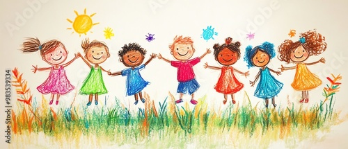 cartoon, toddler, race, play, together, simple, shape, stick, childlike, design, expression, children, whimsy, joyful, comfort, vibrant, narrative, graphic, character, colours, culture, concept, context, friendship, nature, pattern, social, happiness, oneness, connection, beauty, childhood, warmth, inclusive, visual, figure, laughter, scenery