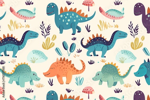Childish dinosaur seamless pattern with lettering for fashion design. Hand drawn vector illustration of cute dinosaurs in pastel colors.