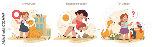 Children and pets set. Exploring responsibilities and joys of pet ownership. Kids developing empathy, social and physical skills. Animal care and emotional support. Flat vector illustration