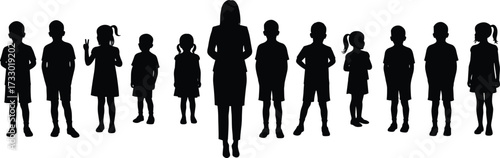 Children and teacher silhouettes, group formation, black icons, white background, school scene, education concept, unity, leadership, classroom, students