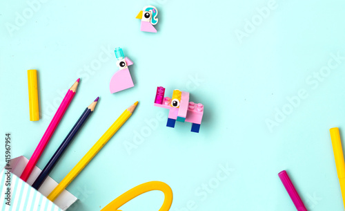 Children art concept colorful flat lay.Work kids desk with craft supplies top view. Children education themed photo.