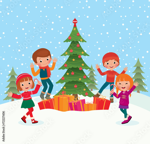 christmas, children, teenage, christmas tree, tree, vector, happy, illustration, cute, dancing, winter, friendship, friends, cartoon, christmas, funny, green, girl, holiday, smile, fun, card, snow, character, merry, casual attire, season, celebration, happiness, cheerful, sweet, children, joy, gift, smiling, small, boy, party, children, full-length, little, new year, present, childhood, box, tradition