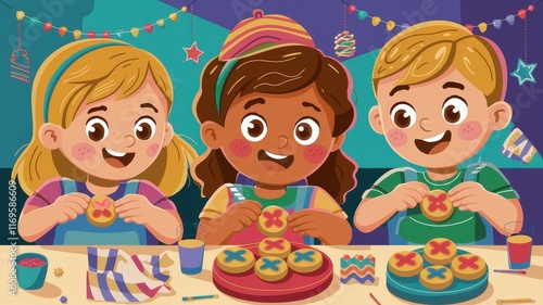 children, decorating, cookie, together, festive, celebration, joy, creativity, fun, colourful, sweet, treat, party, smile, laughter, friends, activity, playful, happiness, art, design, baking, dessert, childhood, gathering, cheerful, vibrant, food, enjoyment, hand, sharing, excitement, imagination, culture, community, teamwork, delicious, favor, colours, joyfulness