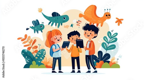 children, playing, educational, game, technology, interaction, learning, creativity, engagement, gaming, entertainment, adventure, exploration, imagination, digital, colourful, nature, friendly, teamwork, activity, animated, life events, design, graphic, fun, discovery, joy, device, joyfulness, collaboration, innovative, bright, playful, visual, excitement, group, imaginative, character, cartoon, environment, scenario, storytelling, unique
