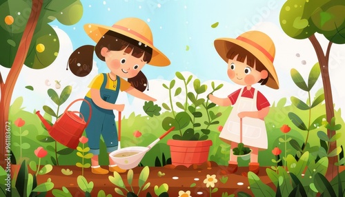 children, children, gardening, plant, flower, pot, watering can, shovel, rake, garden, spring, summer, nature, happy, fun, friendship, teamwork, cute, cartoon, illustration, green, red, yellow, brown, white, blue, vivid colors, green leaf, flower, family time, fresh air, healthy lifestyle