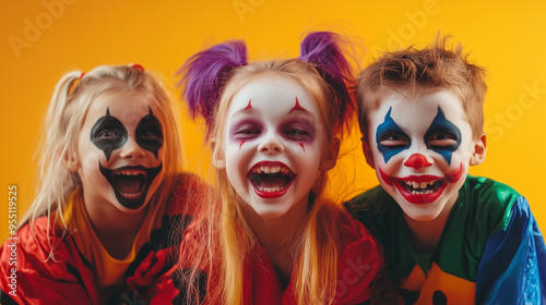 children, children, halloween, dressed, creepy, clown, vibrant, make-up, colourful, costume, group, scarey, skittish, face, paint, eerie, orange, young, horror, dramatic, character, costume, expressive, bold, high-coloured, season, portrait, celebration, fun, sinister, theatrical, intense, children, nightmare, festival, party, friends, joker, girl, man, boy, background, trick, treat, 2024