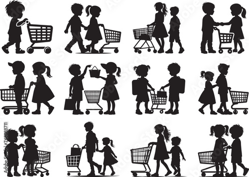 Children in holding a shopping cart Silhouette Vector Illustration set