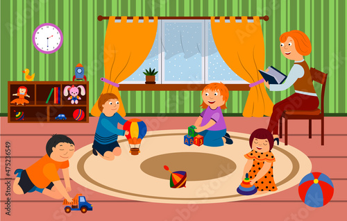 Children in kindergarten are sitting on the carpet with the teacher, the teacher is reading a book, children are playing with toys. vector isolated on a white background