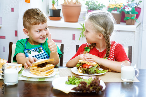 Children make sandwiches in the kitchen . Funny kids make sandwiches