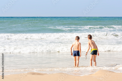 beach, water, sea, sand, standing, nature, little, vacation, summer, shore, children, wave, ocean, children, holiday, travel, beauty, coast, surf, tropical climate, people, coastline, little boy, landscape, horizon, back, time, trip, rest, life, entry, children, sun, childhood, season, birth, background, tan, swimwear, pretty, blue, fun, rear, authentic, swimming, 2, boy