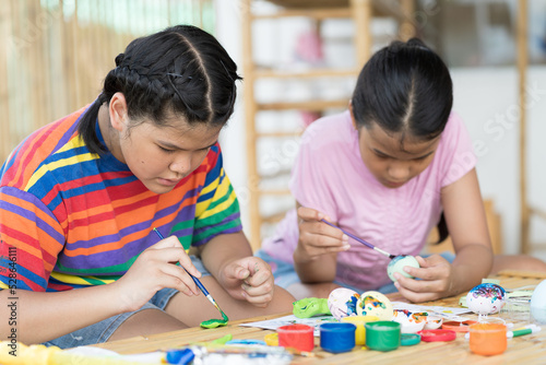 Children painting eggs with brush in class workshop. Two girl sculpts modeling clay multi-colored plasticine in class of school. craft and clay art and education concept