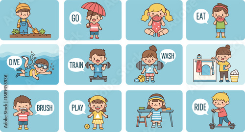Children performing daily activities with action words like eat, play, brush, ride, dive in educational cartoon vector illustration set