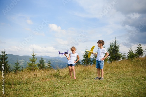 Children pilot aviator with airplane dreams of traveling in summer in nature. Vacation concept.