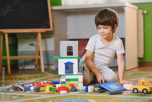 Children play with a toy designer on the floor of the children's room. Boy playing with colorful blocks. Kindergarten educational games.