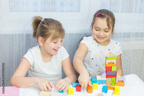 Children play with an educational toy on table in the children's room. Two kids playing with colorful blocks. Kindergarten educational games