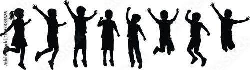 Children silhouettes jumping, happy kids playing vector, group of boys and girls, joyful childhood, fun activity, black figures, isolated background