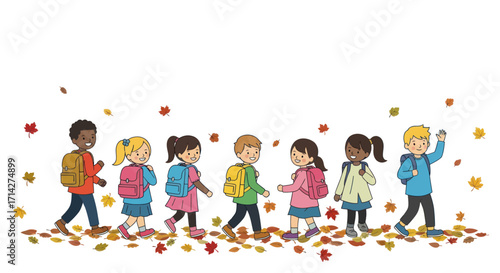 children, children, school, walking, autumn, leaf, fall, diverse, colourful, backpack, student, education, elementary, group, cartoon, illustration, happy, friendly, pathway, nature, learning, back to school, friendship, community, drawing, art, design, character, smiling, multicultural, elementary school, school supplies, outerwear, clothing, animated, character