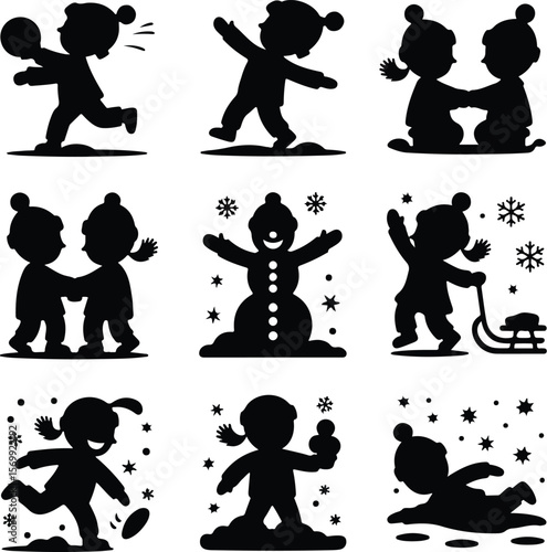 children, snow, play, winter, fun, children, cold, game, icon, silhouette, vector, black, outline, holiday, boy, girl, cute, snowball, frosty, season, festive, smile, chill, joy, family, happy, snowman, cosy, walk, run, slide, bundle, freeze, park, ice, swing, pose, moment, scene
