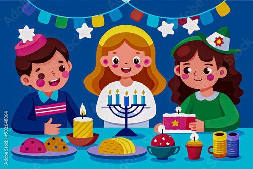 jewish, cartoon, cake, birthday, children, illustration, vector, woman, food, boy, party, children, celebration, children, cafes, people, children, eating, fun, dinner, family, hot drink, eat, baby, cooking