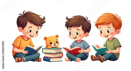 Children's Book Club Illustration with Three Boys and Cute Teddy Bear Enjoying Reading Together
