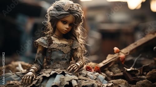 children's doll against the background of a destroyed house .destruction due to the effects of natural disasters or war.
