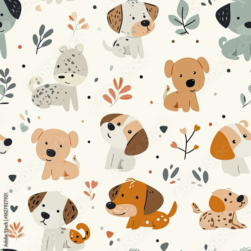 Children's seamless pattern with dogs and plants.