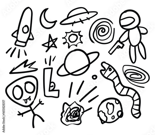 space, cartoon, drawing, rocket, moon, sun, flying saucer, astronaut, alien, planet, worm, galaxy, star, cosmic, universe, celestial, black, white, children, children, art, doodle, simple, illustration, vignetting, fantasy, imagination, science fiction, fun, whimsical, space exploration, space-travel