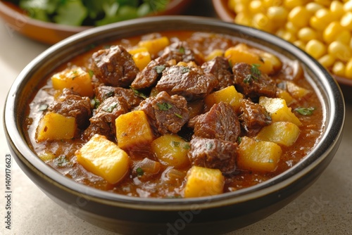 Chilean stew with dried meat, Charquican served in bowl, rich color, garnished with herbs. Concept of Chilean stew with dried meat creating warm, inviting atmosphere.