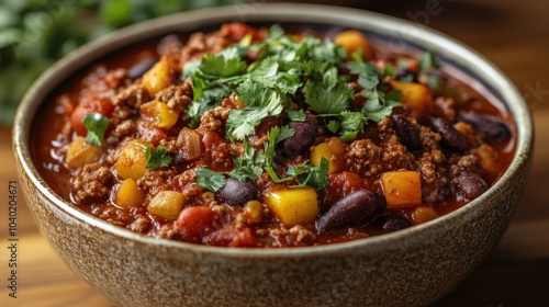 chili, bowl, food, garnish, receipe, dinner, meal, vegetable, tomatoes, corn, meat, beef, bean, black, bean, ground, spicey, savoury, comfort, cookery, american, mexican, southwestern, favor, red, brown, green, cilantro, dish, delicious, appetising, tasty, healthy, protein, fiber, lunch, pot, rustic, home, cooking, epicure, homemade, hot, warm, stew, hearty
