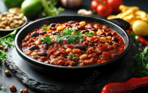 chili, con, carne, dish, food, meal, dinner, lunch, receipe, cookery, spice, bean, tomatoes, ground, beef, meat, vegetable, onion, garlic, chiles, pepper, parsley, cilantro, powder, cumin, flavorful, savoury, hearty, comfort, red, brown, black, stone, frying pan, plaster bandage, iron, rustic, kitchen, home, spicey, hot, delicious, tasty, appetising, classic, traditional, mexican, american, southwestern