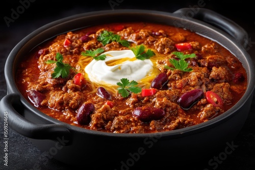 Chili con Carne mit Kidneybohnen und Sauerrahm würziges Hackfleisch-Bohnen-Eintopfgericht mexikanische Tex-Mex Küche dampfend heiß serviert mit frischer Petersilie Nahaufnahme Food Fotografie