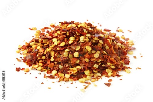 chili, hot, red, flake, food, ingredient, spice, flavouring, pile, heap, isolated on white, isolated, white background, horizontal, photograph, nobody, closeup, macro, spicey, herb, crushed, organic, healthy eating, ground, textured, seasoning