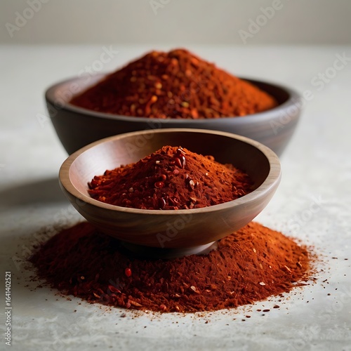 Chili Powder Bowl With Piles Of Dry Chilies isolated on wooden background